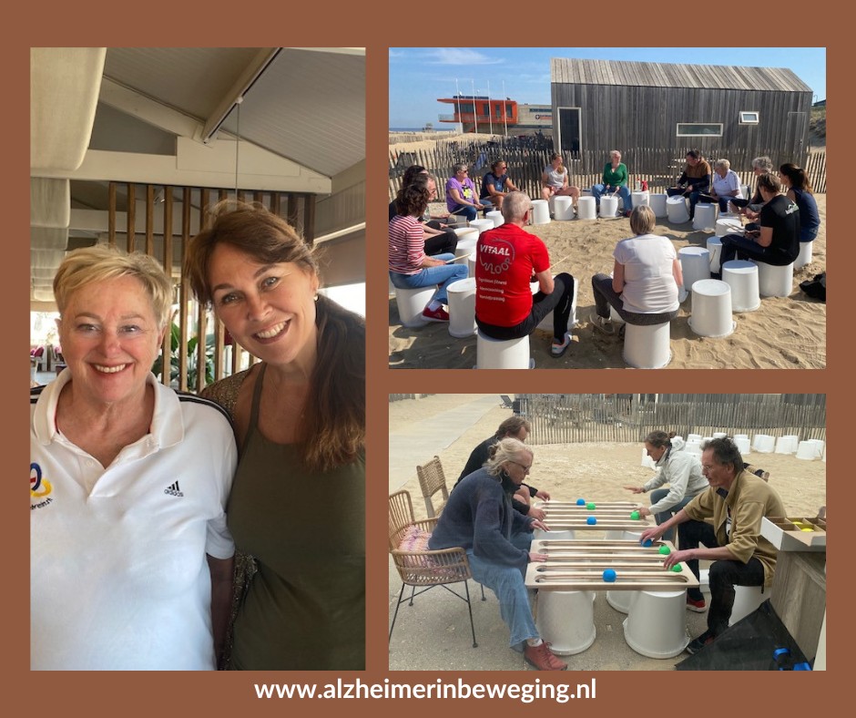 Op donderdag 2 mei is het schitterend strandweer en dat komt goed uit voor deze dag in en om Sisters Beach in Katwijk. De meeste workshops kunnen gewoon in de buitenlucht plaatsvinden. Louis Pals, bestuurslid van de Stichting Alzheimer in Beweging bijt het spits af met emmerdrummen, die keuze is niet voor niets gemaakt. Door samen deze opening te beleven en te beginnen met een mooie uitdaging wordt meteen een sfeer van verbondenheid en veiligheid gecreëerd. Louis begint maar met een waarschuwing, als je meedoet met deze workshop dan doen hormonen hun werk en ga je elkaar aardig vinden. Het is niet alleen gaaf om een bepaald patroon te leren drummen, hiermee wordt een flinke inzet gevraagd van het brein. Na 2 roffels begint Louis iedereen al aardig te vinden. De toon is gezet en er wordt wat afgelachen. De dag kan na dit leuke begin al bijna niet meer stuk.